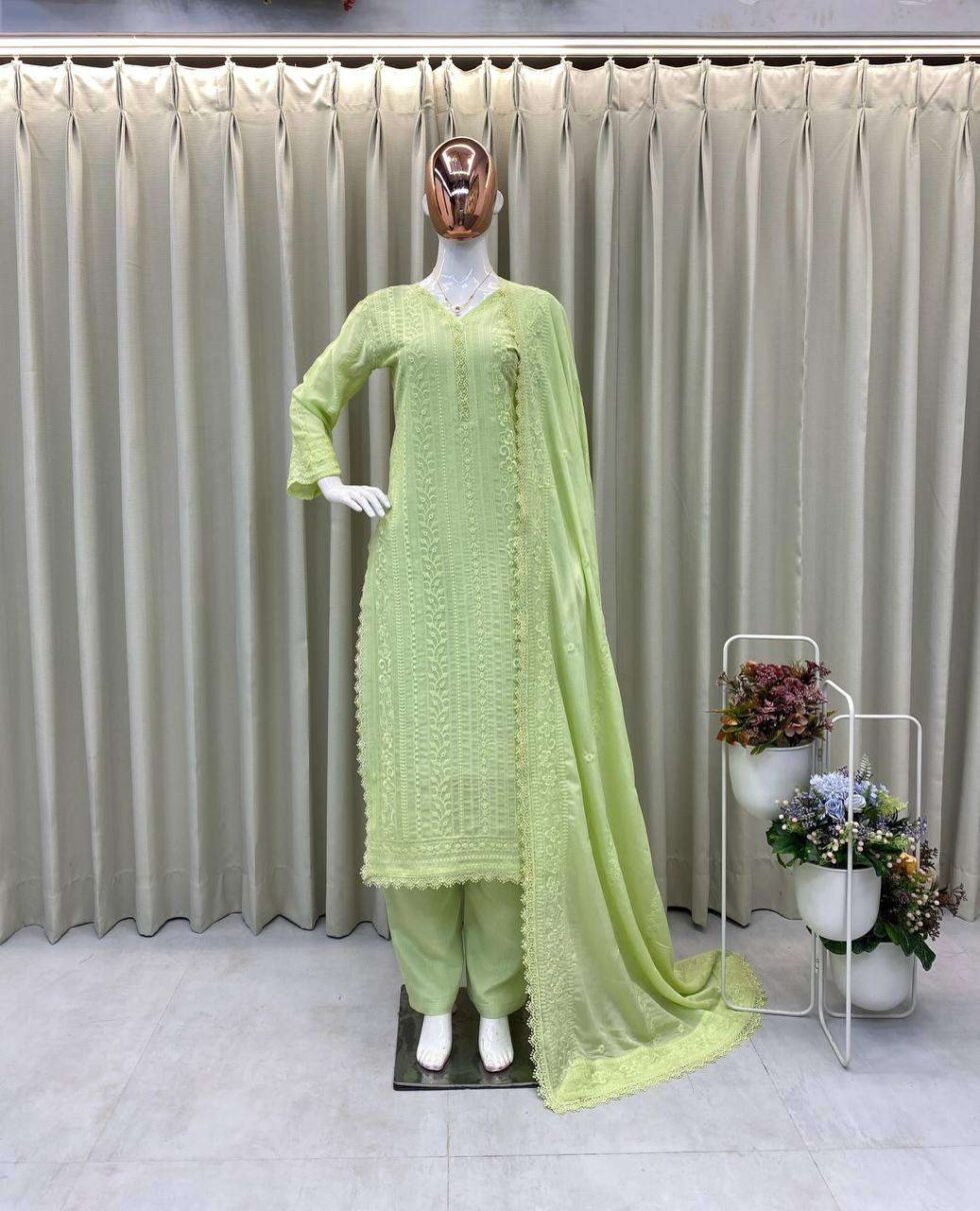 Women’s Chinon Silk with Cotton Thread Embroidery Straight Kurti With Pant and Dupatta set